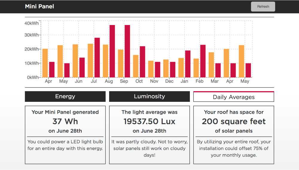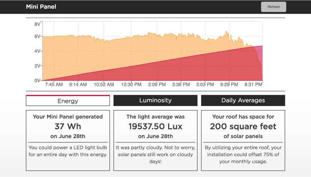 I got home and saw zero charge. I left the panel out in the backyard for two more hours, but still barely got any charge on the battery. The key lesson there was that solar can be extremely slow. We would need to visualize the data in real-time in order to keep a customer engaged.