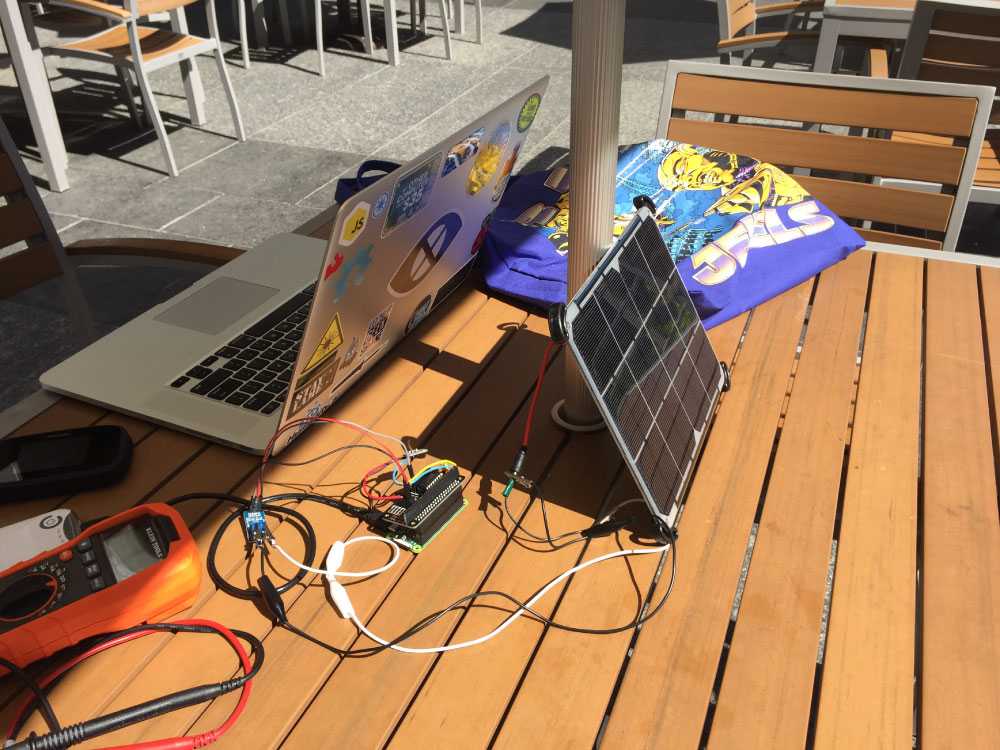 The field test went well, and I was able to verify that the voltage being sent to the database was accurate with a multimeter. The next step in our process was to start collecting enough data to explore. I took the prototype home and set it outside for two days to start collecting data. The first day I leaned the panel up against a window on the front of my house, which allowed it to get a good stretch of direct sunlight. When noon hit, I realized that I would need to move the unit to simulate a roof-based panel since the sun was now moving over the house. It wasn’t an ideal testing environment, but I went ahead and moved the panel to the backyard for the afternoon.