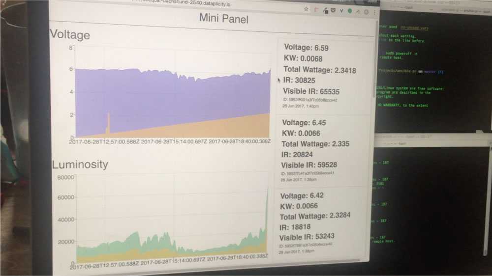 The full dashboard evolved into something much easier to interact with. The first screen shows the averaged voltage every minute in orange, and the total power generated in red. The second screen shows our luminosity readings from the day–this particular screen is showing the rainy day readings. If you cross reference the luminosity readings with the power readings, you’ll see that our power didn’t dip when we bumped into cloudy conditions.